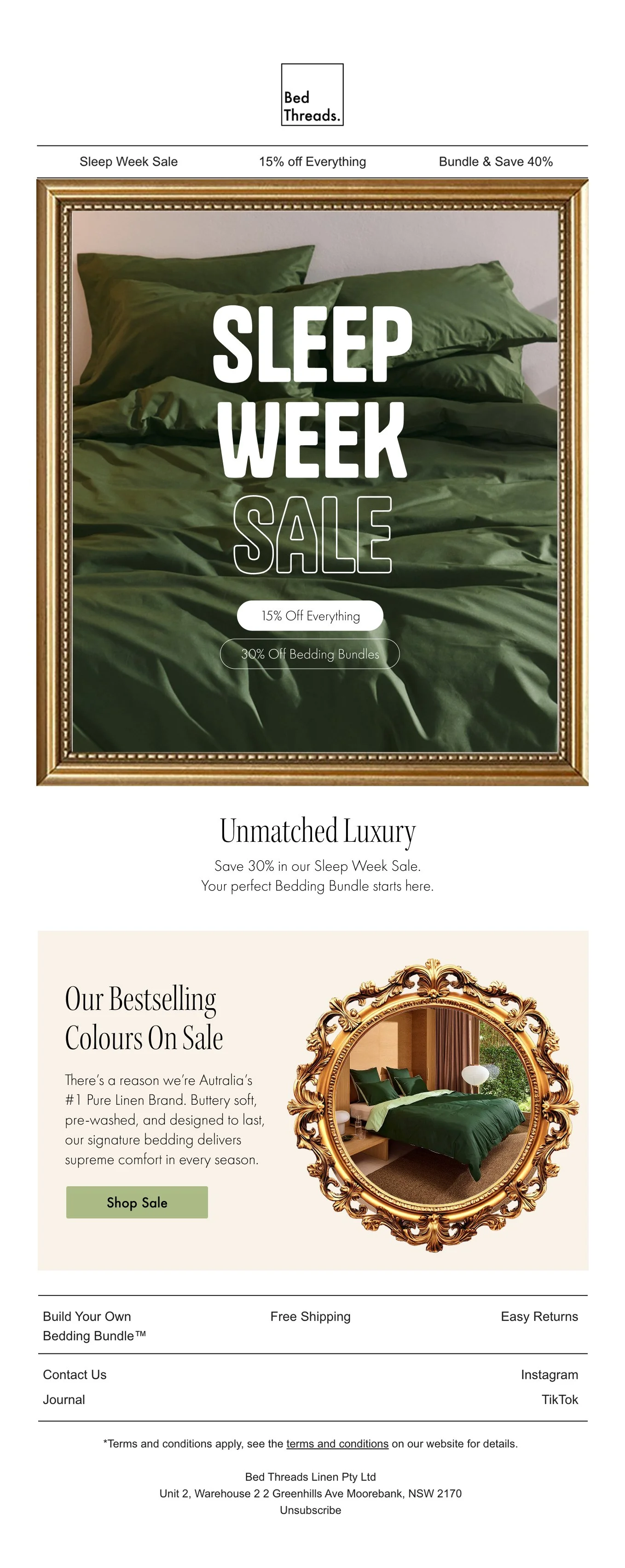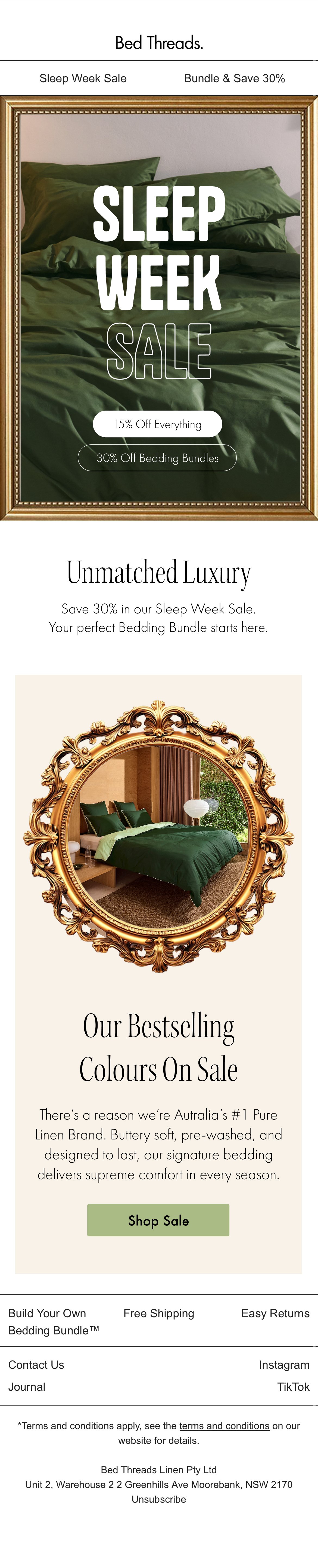 Whilst browsing the Bed Threads site, the phrase ‘Unmatched Luxury’ stood out to me - so I took inspiration from this wording to create a contrast of luxurious ornate motifs, paired with the clean and contemporary Bed Threads imagery. The antique frames create a visual thread that cuts through the BAU Bed Threads aesthetic, whilst the bold campaign typography anchors the visuals back to here and now.