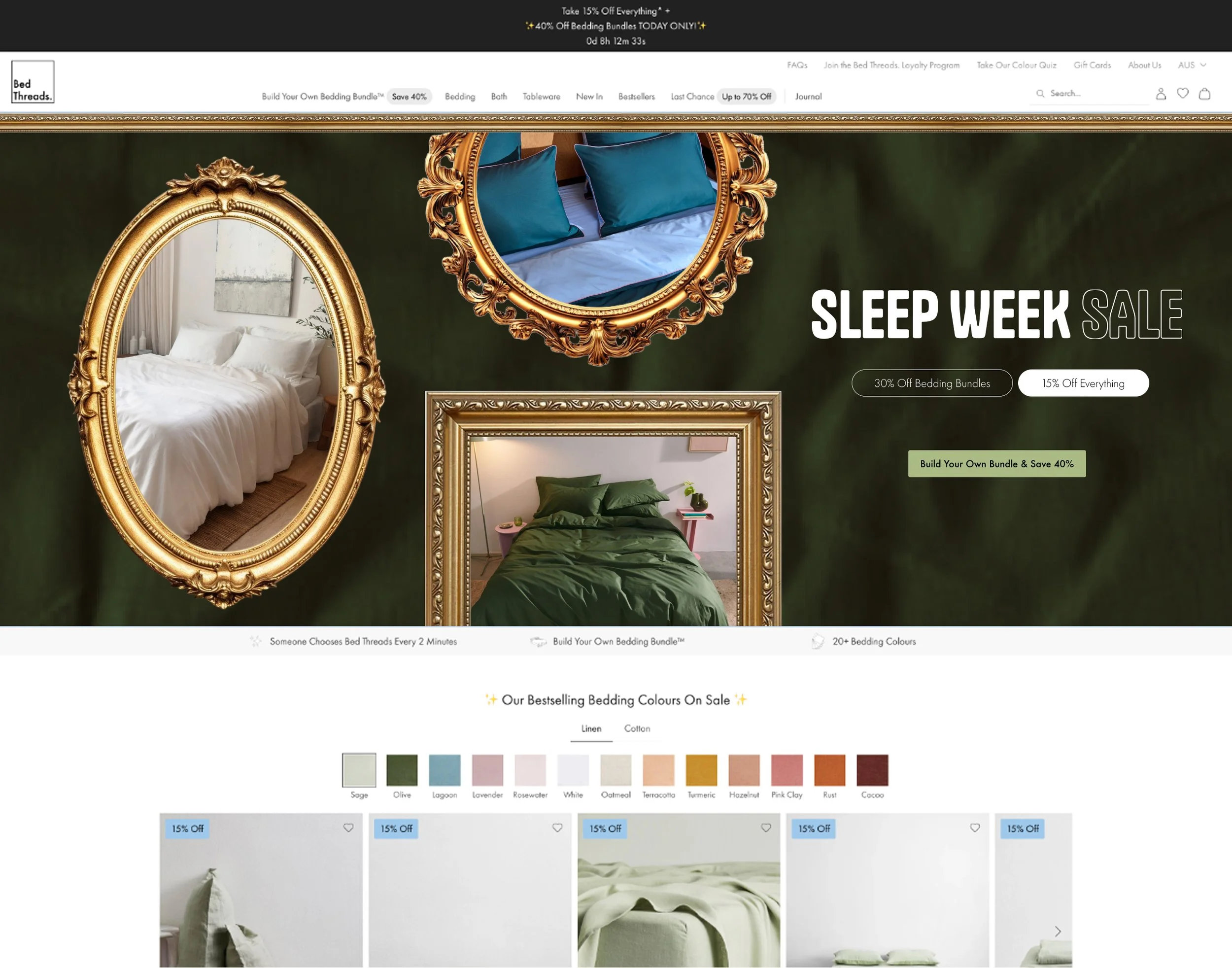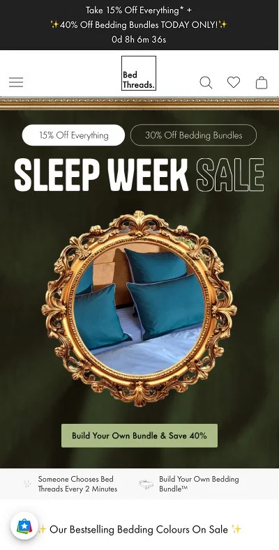 I workshopped incorporating more bold CTA styles (ie additional stickers or playful shapes) - however the typography and frame graphic are quite striking as is, so have opted for a clean and simplified button style to ground us back in the restrained Bed Threads world.